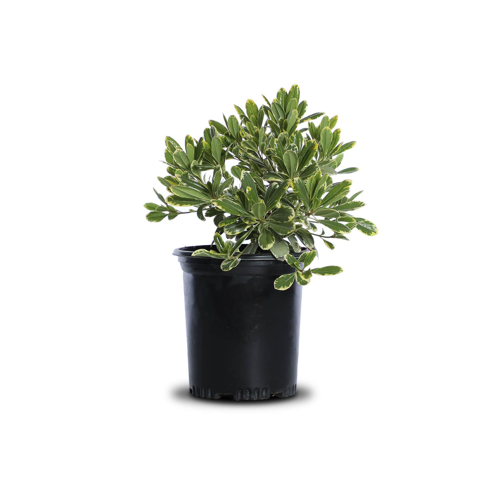 Cream de Mint Pittosporum is a compact evergreen shrub known for its attractive variegated leaves, which feature creamy white edges surrounding a lush mint green center. This hardy plant is often used in gardens and landscapes for its ornamental qualities and its ability to tolerate a variety of conditions. It can thrive in full sun to partial shade and is ideal for borders, hedges, or as a decorative accent.