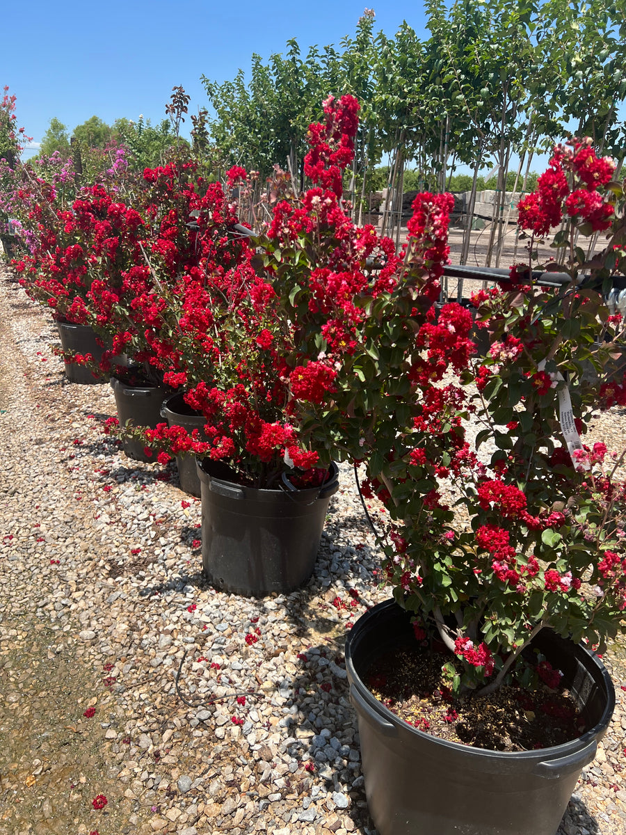 Dynamite Red Crape Myrtle is a popular ornamental tree known for its striking, vibrant red flowers that bloom throughout the summer. This deciduous plant features glossy green leaves that turn to beautiful shades of orange and red in the fall, providing year-round interest. It is well-suited for warm climates and prefers well-drained soil, making it a favorite choice for landscaping and gardens.