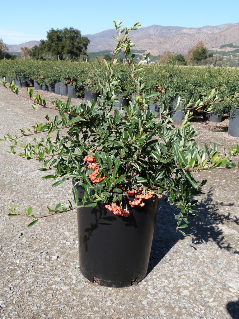 The Santa Cruz Firethorn is a hardy, evergreen shrub known for its glossy, dark green leaves and striking orange-red berries that attract birds. It is often used for hedges and ground cover in landscaping, providing year-round interest with its ornamental qualities. Additionally, this plant is drought-tolerant and well-suited for various soil types, making it a popular choice in sustainable gardening.